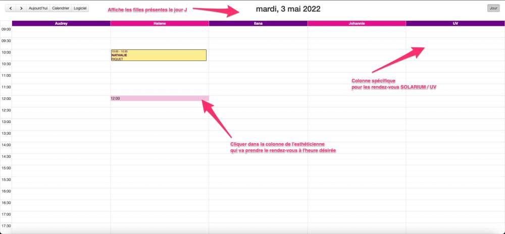 Chaque colonne est réservées aux rendez-vous d'une esthéticienne en particulier, à l'exception e la colonne optionnelleItalique UV qui permet de mettre les rendez-vous non attribués à une fille en particulier.