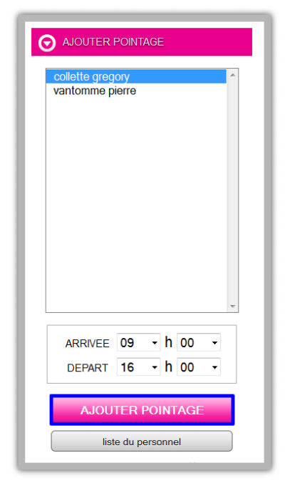 Afficher le texte sourceAnciennes révisionsLiens de retourAjouter au livre.Exporter en PDFExporter la page en HTML/PDFHaut de page Share via Share via... Twitter LinkedIn Facebook Pinterest Telegram WhatsApp Yammer Reddit TeamsDerniers changementsSend via e-MailImprimerPermalien × Créateur de livres Ajouter cette page à votre livre Créateur de livres Retirer cette page de votre livre Voir ou modifier le livre(0 pages) Aide Pointage/Horaires Pour afficher le pointage il faut cliquer sur l'onglet “Pointage” présent dans le cadre bleu en bas de l'écran. Pour effectuer un pointage , sélectionner l'employé à pointer, sélectionner l'arrivé et le départ et cliquer sur “AJOUTER POINTAGE” pour valider. Tout les pointages créés sont rajoutés ici. /home/aide/public_html/data/pages/employe_horaire/pointage_horaires.txt Dernière modification : 2015/08/10 18:12de epotam