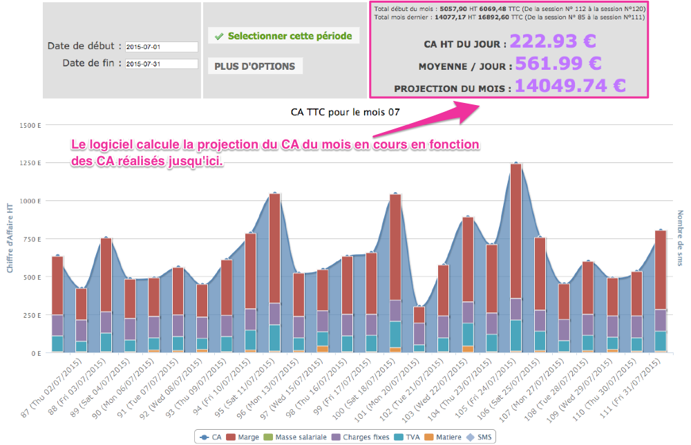 Vous visualisez ici les sessions du mois en cours sous forme de graphique détaillé comprenant :