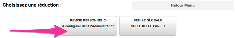 Une fois configuré, dans la vente, en cliquant sur REDUCTIONS puis sur REMISE PERSONNEL, le logiciel appliquera le pourcentage configuré pour chaque catégorie.