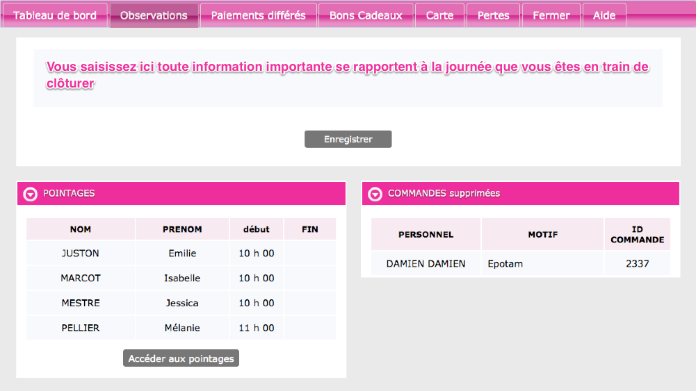 Vous retrouvez également les pointages personnels ainsi que la liste de toutes les commandes supprimées.